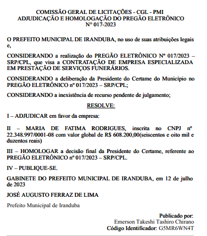 Segundo informações publicadas no Diário Oficial dos Municípios do Amazonas (DOM-AM), datadas de 31 de julho deste ano, a prefeitura de Iranduba planeja desembolsar exatamente o montante de R$ 608,2 mil (seiscentos e oito mil e duzentos reais) para esse fim específico. A empresa escolhida para fornecer tais serviços foi identificada como Maria de Fátima Rodrigues, registrada sob o CNPJ nº 22.348.997/0001-08.