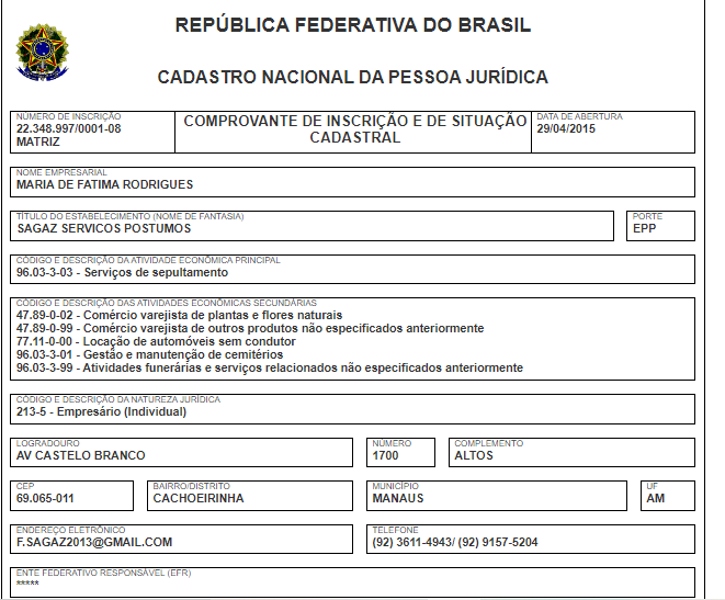 De acordo com dados fornecidos pela Receita Federal, esta empresa aparentemente beneficiada ostenta um capital social de modestos R$150 mil e foi estabelecida em 29 de abril de 2015. Seu endereço de operação está situado no bairro Cachoeirinha, zona Sul de Manaus e a sua principal atividade econômica é serviço de sepultamento.