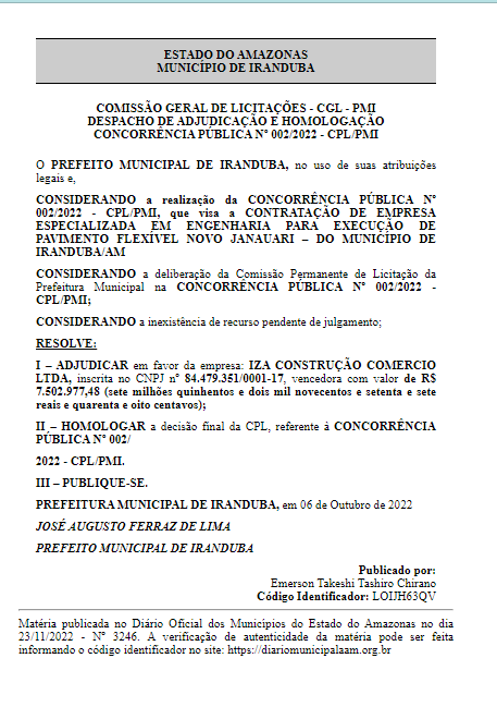Conforme o despacho, que foi publicado no Diário Oficial dos Municípios do Amazonas (AAM), dessa quarta-feira, 23, a empresa foi contratada para serviço de engenharia “para execução de pavimento flexível novo Janauari – do município de Iranduba”.