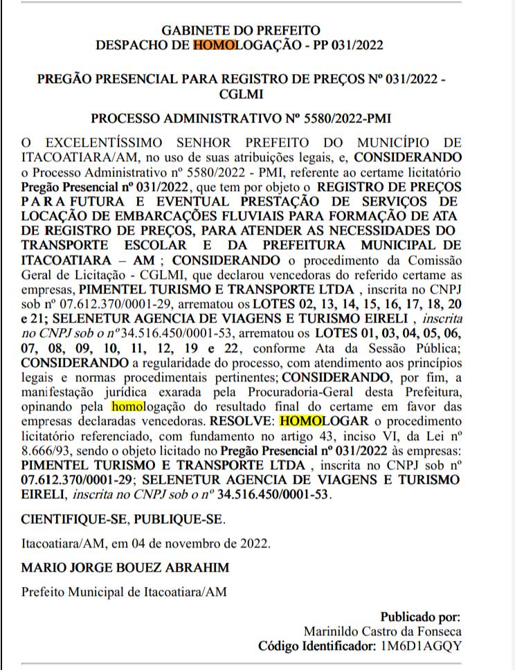 O Pregão Presencial para Registro de Preços nº 031/2022 foi publicado no Diário Oficial dos Municípios do Amazonas, assinado pelo prefeito no dia 4 de novembro.