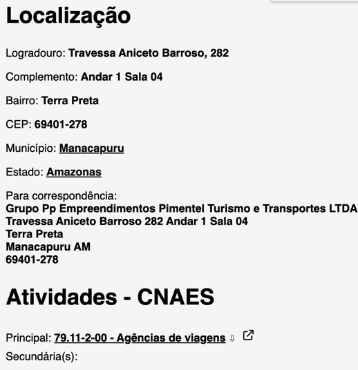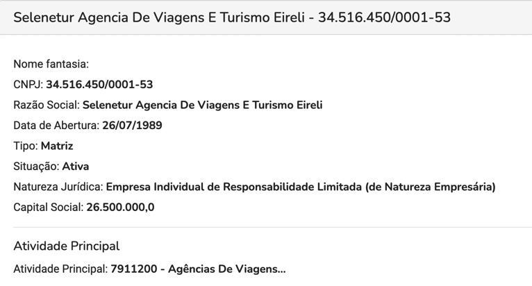 A outra empresa vencedora é a Selenetur Agência de Viagens e Turismo Eireli (CNPJ: 34.516.450/0001-53), que ganhou 13 lotes da licitação (01, 03, 04, 05, 06, 07, 08, 09, 10, 11, 12, 19 e 22). Segundo a transparência na Receita Federal, atividade principal da Selenetur está descrita como “Agência de viagens”. A sede da empresa fica atualmente em Manaus e possui capital social de R$ 26,5 mil. O sócio-administrador é Marcio Rossi Perez. Veja: