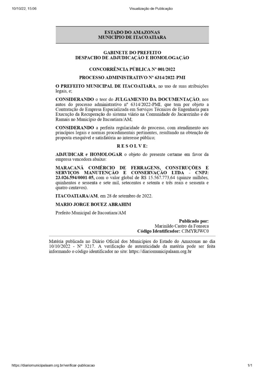 Segundo a publicação a empresa que vai realizar o serviço é a Maracanã Comércio de Ferragens, construções e serviços, manutenção e conservação Ltda.- CNPJ: 23.026.594/0001-05, tem como nome fantasia Construtora Maracanã. O valor global do contrato é de R$ 15.567.773,64 (quinze milhões, quinhentos e sessenta e sete mil, setecentos e setenta e três reais e sessenta e quatro centavos), e foi assinado pelo prefeito Abrahim no dia 28 de setembro de 2022.