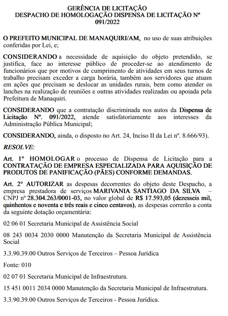 Amazonas – O Prefeito de Manaquiri, Jair Aguiar Souto, contratou a empresa prestadora de serviços MARIVANIA SANTIAGO D. MARIVANIA SANTIAGO DA SILVA, no CNPJ nº 28.304.263/0001-03, 28.304.263/0001-03, para aquisição de produtos de panificação, ou seja, pães para servidores da Prefeitura.