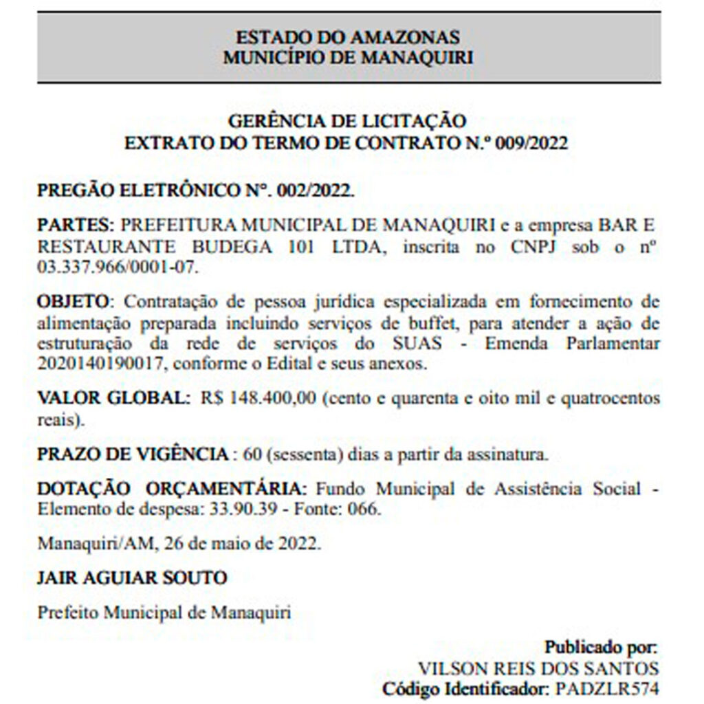 Amazonas – A prefeitura de Manaquiri também deve virar algo do Ministério Público do Amazonas (MP-AM), referente aos últimos gastos com o dinheiro público. O prefeito Jair Souto, vai gastar mais de R$ 100 mil na contratação de um buffet. A informação consta no Diário Oficial dos Municípios nesta segunda-feira (20).