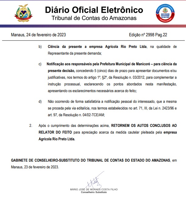Com a admissão da Representação, a Prefeitura de Manicoré e o prefeito Lúcio Flávio (PSD) serão notificados para apresentar defesa. Além disso, o TCE-AM determinou a suspensão do Pregão Eletrônico nº 037/2023 até que a decisão final seja proferida.