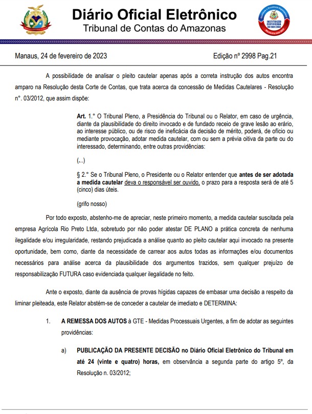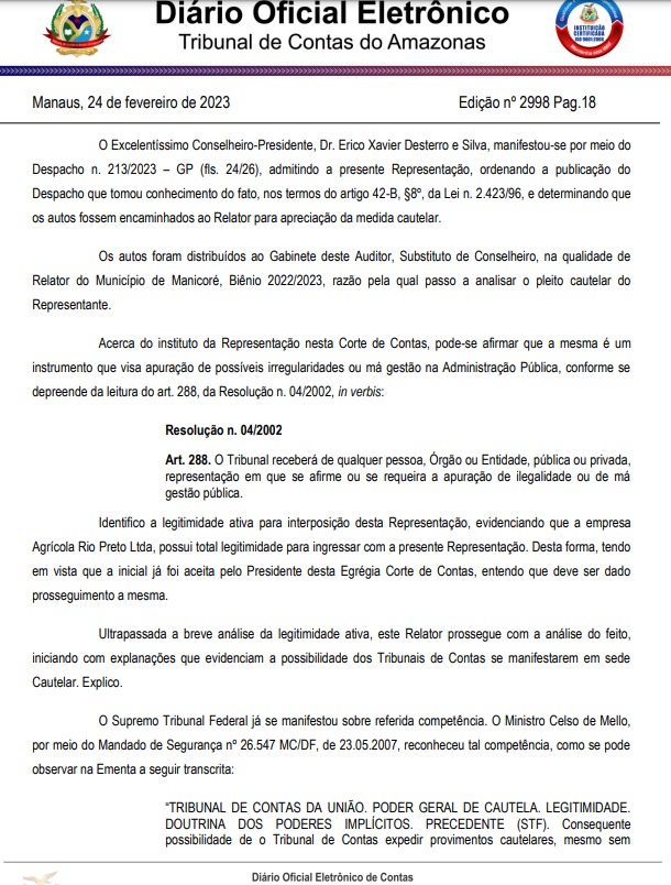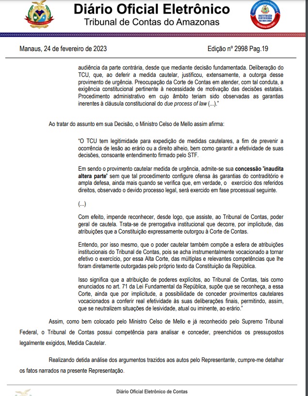 O conselheiro-presidente do Tribunal de Contas do Estado do Amazonas (TCE-AM), Érico Xavier Desterro e Silva, que assina o despacho, manifestou a favor da admissão da medida. “A Representação está prevista no art. 288 da Resolução nº 04/2002 – TCE/AM, sendo cabível em situações que se afirme ou requeira a apuração de ilegalidade ou má gestão pública, bem como nos casos expressos em lei, especialmente os referidos na Lei n° 14133/2021
