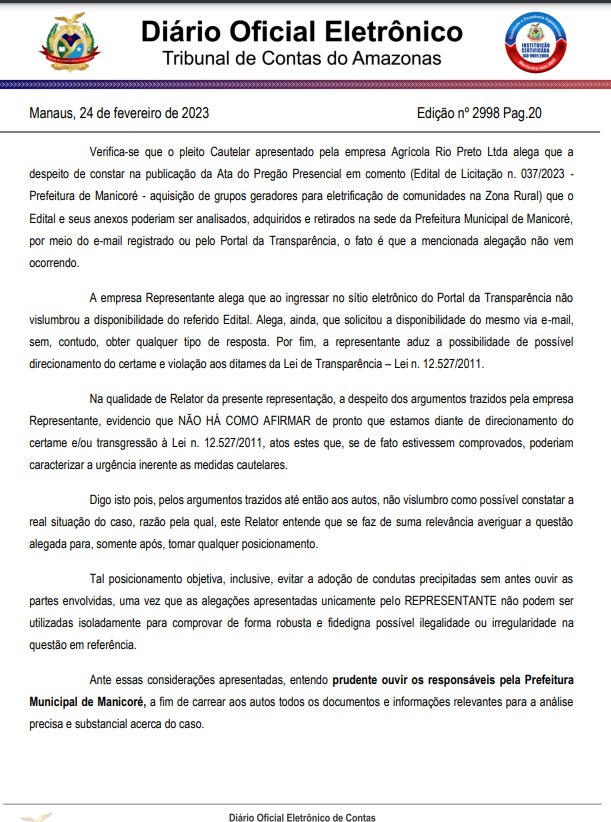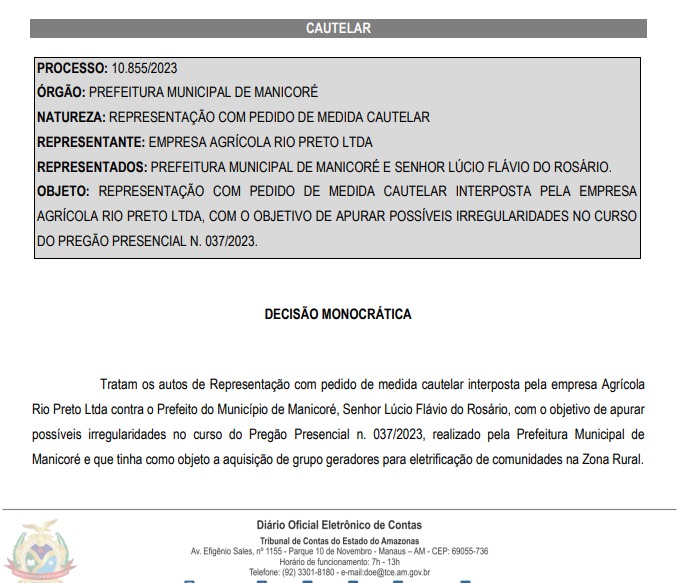 Amazonas – O Tribunal de Contas do Estado do Amazonas (TCE-AM) admitiu Representação com pedido de Medida Cautelar contra a Prefeitura de Manicoré e o prefeito Lúcio Flávio (PSD) por supostas irregularidades em um Pregão Eletrônico nº 037/2023 para aquisição de grupo de geradores para eletrificação de comunidades na Zona Rural. A medida foi publicada no Diário Oficial Eletrônico (DOE) no último dia 23 de fevereiro. O órgão deu 5 dias para a gestão do prefeito Lúcio Flávio explicar os indícios de irregularidades dentro do processo licitatório.