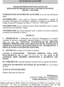 Amazonas – A Prefeitura do município de Manicoré, comandada pelo prefeito Lúcio Flávio (PSD), gastará mais de R$2,8 milhões em serviços hospitalares para a realização de consultas e cirurgias eletivas oftalmológicas em atendimento à população do município. O documento com o valor exorbitante foi publicado no Diário Oficial dos Municípios do Estado do Amazonas, em 24 de março.