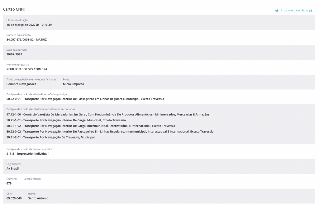 A empresa vencedora do processo de licitação e que vai receber o aporte de R$ 1.144.500,00 é a Regilson Borges Coimbra, inscrita sob o CNPJ Nº 84.097.476/0001- 82. Na Receita Federal, consta que a entidade jurídica tem como atividade econômica principal “Transporte por navegação interior de passageiros em linhas regulares, municipal, exceto travessia”.