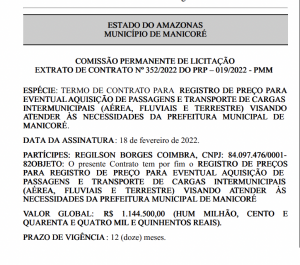 Amazonas – Mais uma contratação do Prefeito de Manicoré, Lúcio Flávio do Rosário (PSD), está dando o que falar no município. Desta vez, o gestor vai gastar mais de R$1,1 milhão em contratação de empresa para a aquisição de passagens e transportes de cargas intermunicipais (aérea, fluvial e terrestre) no município.
