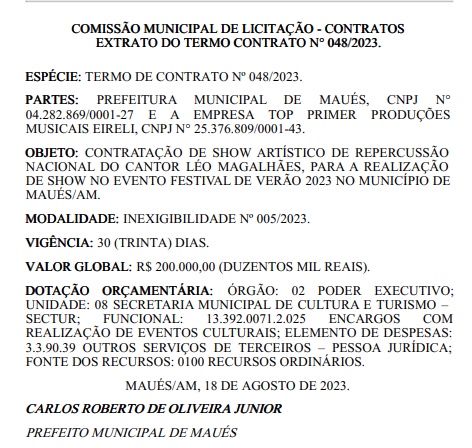 Amazonas – O prefeito de Maués, Júnior Leite, usou R$ 200 mil dos cofres públicos para contratar o show do cantor Léo Magalhães no município. A informação foi confirmada após a publicação no Diário Oficial dos Municípios do Amazonas, nesta segunda-feira (21).