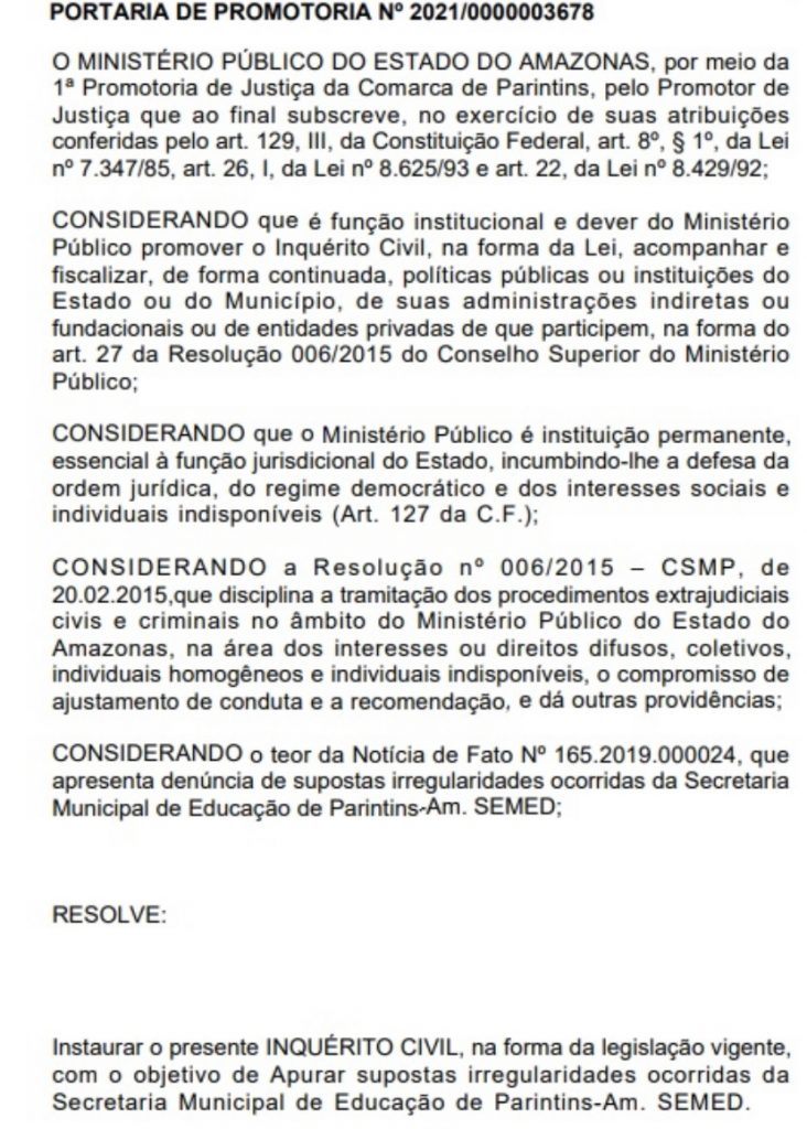 O promotor de Justiça, Marcelo Bitarães de Souza Barros, considerou o teor da Notícia de Fato Nº 165.2019.000024, que apresenta supostas denúncias de irregularidades ocorridas na Secretaria Municipal de Educação de Parintins.