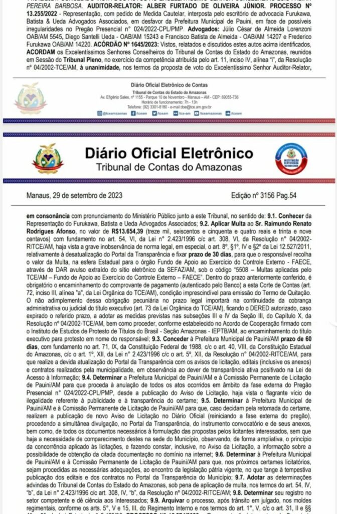 Amazonas – O prefeito de Pauini, Renato Afonso (PSD), enfrenta severas multas do Tribunal de Contas do Estado do Amazonas (TCE-AM) devido a irregularidades apontadas no Pregão Presencial n⁰ 024/2022.