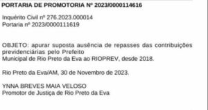 O documento, assinado pelo promotor Ynna Breves Maia Veloso, apura suposta ausência de repasses das contribuições previdenciárias pelo prefeito ao RIOPREV, desde 2018.