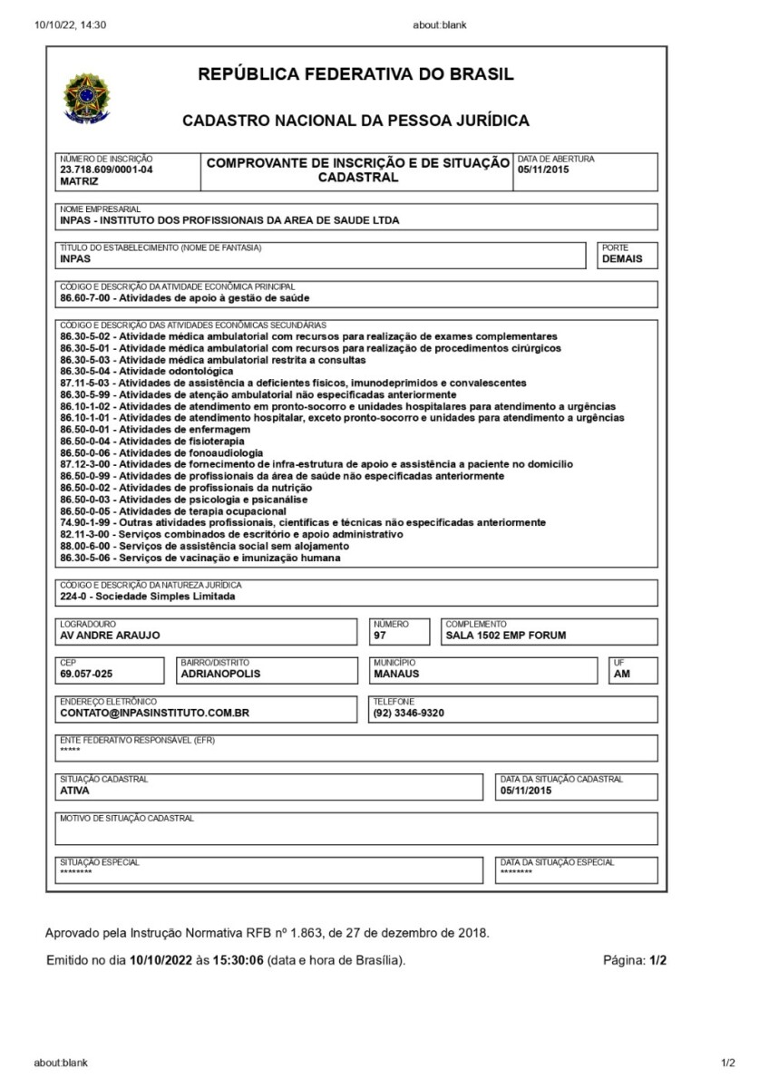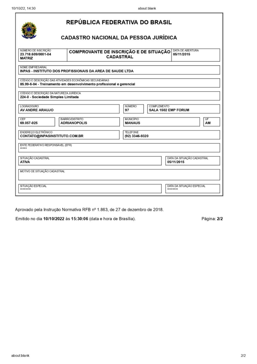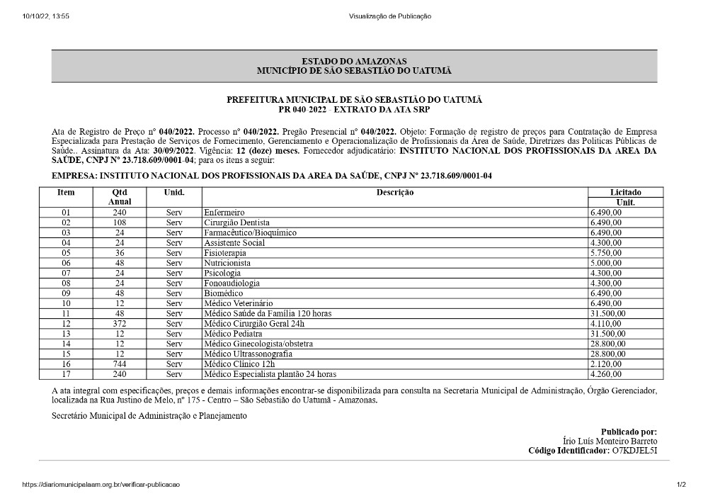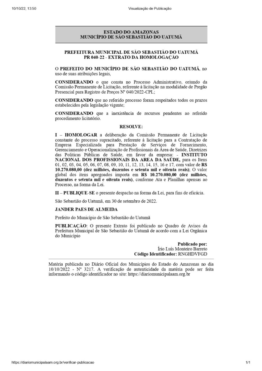 Conforme a publicação a empresa vencedora do certame é o Instituto Nacional dos Profissionais da Área da Saúde, CNPJ Nº 23.718.609/0001-04, tem como nome fantasia INPAS, localizada no bairro Adrianópolis, em Manaus. Ainda de acordo com a publicação, o contrato tem a duração de 12 meses e o valor global de R$ 10.270.080,00 (dez milhões, duzentos e setenta mil e oitenta reais).