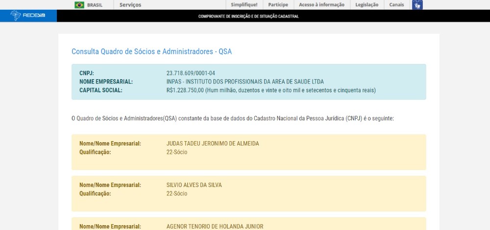 Em consulta ao quadro de sócios e administradores da empresa, consta o nome dos médicos pertencentes ao instituto. E o capital sócia deles é de R$1.228.750,00 (Hum milhão, duzentos e vinte e oito mil e setecentos e cinquenta reais).