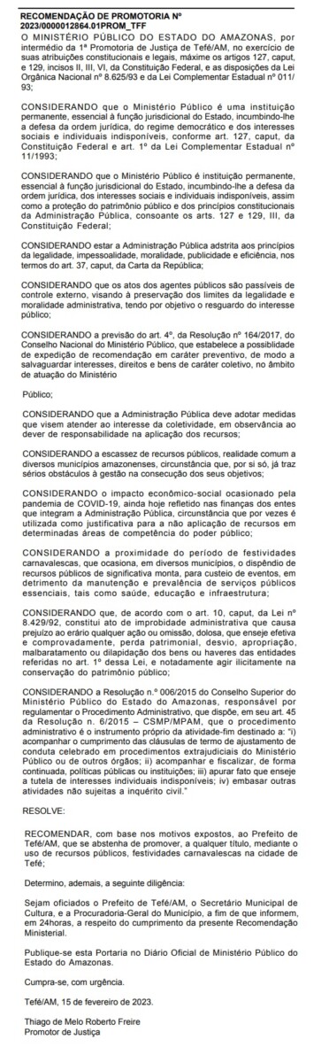 A recomendação destaca que a festividade carnavalesca em Tefé poderia prejudicar a manutenção e prevalência de serviços públicos essenciais, como saúde, educação e infraestrutura. O MPAM afirma que a recomendação tem como objetivo assegurar que os recursos públicos sejam utilizados de forma responsável e visando o bem-estar da população.