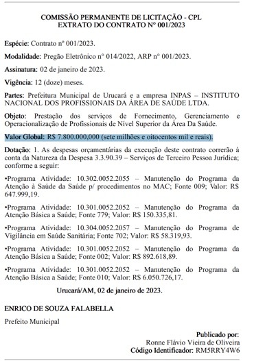 De acordo com as informações divulgadas no Diário oficial (DOM) a comissão permanente de licitação – CPL, a Prefeitura de Urucará contratou a empresa, INPAS – Instituto Nacional dos Profissionais da Área de Saúde LTDA, sob o valor total R$ 7.800.000,000 (sete milhões e oito centos mil e reais). Para realizar serviços de Fornecimento, Gerenciamento e Operacionalização de Profissionais de Nível Superior da Area da Saúde. As despesas orçamentarias deste contrato tende corresponder pela vigência de 12 meses.
