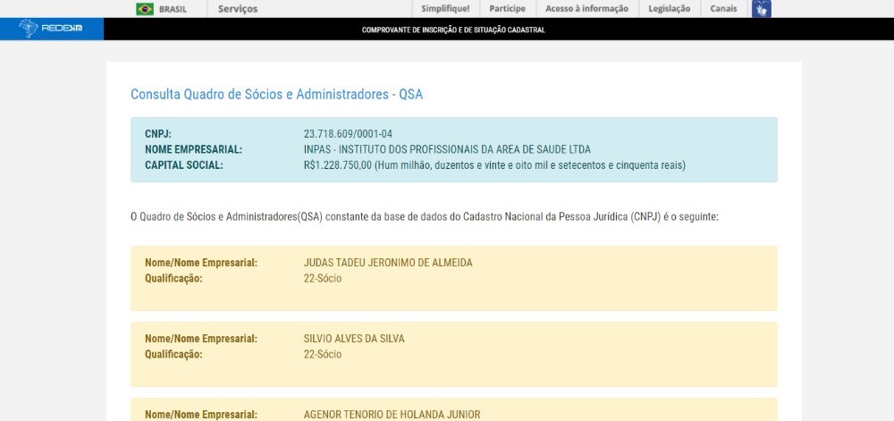 Em consulta ao quadro de sócios e administradores da empresa, consta o nome dos médicos pertencentes ao instituto. E o capital social deles é de R$1.228.750,00 (um milhão, duzentos e vinte e oito mil e setecentos e cinquenta reais).