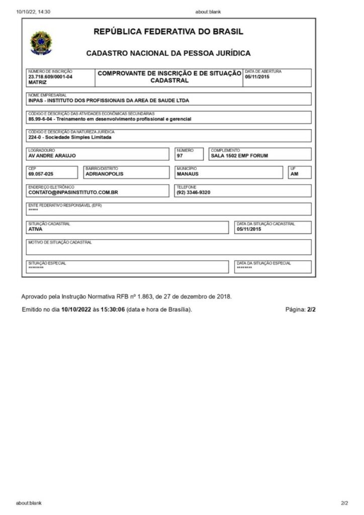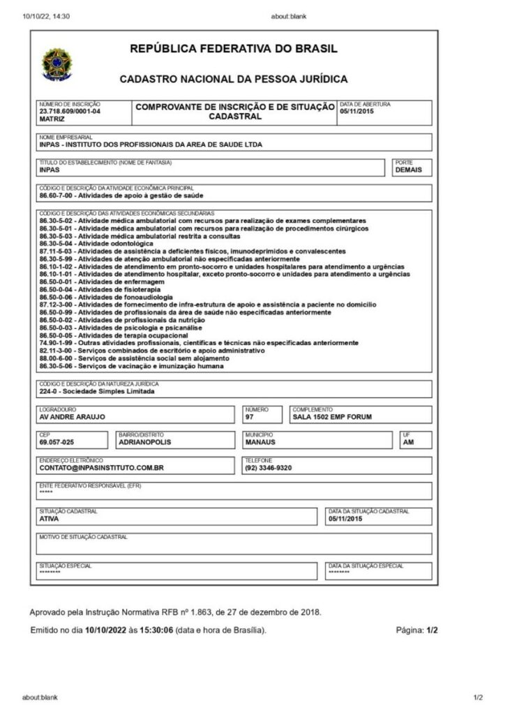 O contrato foi firmado com o INSTITUTO NACIONAL DOS PROFISSIONAIS DA ÁREA DA SAÚDE, CNPJ Nº 23.718.609/0001-04, tem como nome fantasia INPAS, está localizada na avenida André Araújo, nº 97, sala 1502, Adrianópolis-Manaus/Amazonas.