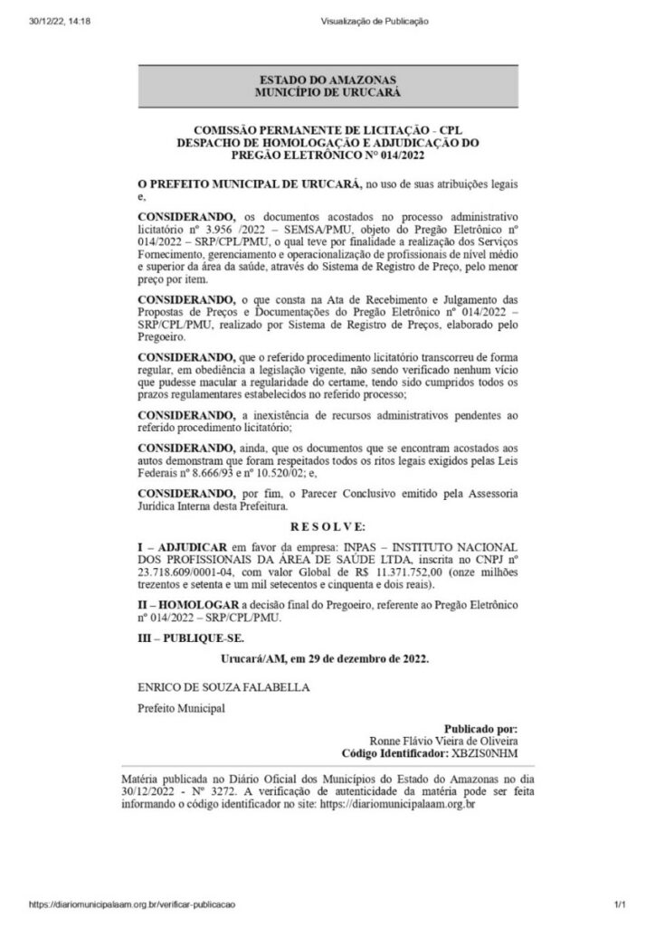 Amazonas – O Prefeito de Urucará Enrico Falabella (MDB) firmou contrato com a empresa Instituto Nacional dos Profissionais da Área de Saúde (INPAS) pelo valor de R$7,5 milhões para prestar serviços de apoio em gestão na área de saúde ao município. A informação foi publicada nesta segunda-feira (13) por meio do Diário Oficial dos Municípios do Estado do Amazonas (DOM).