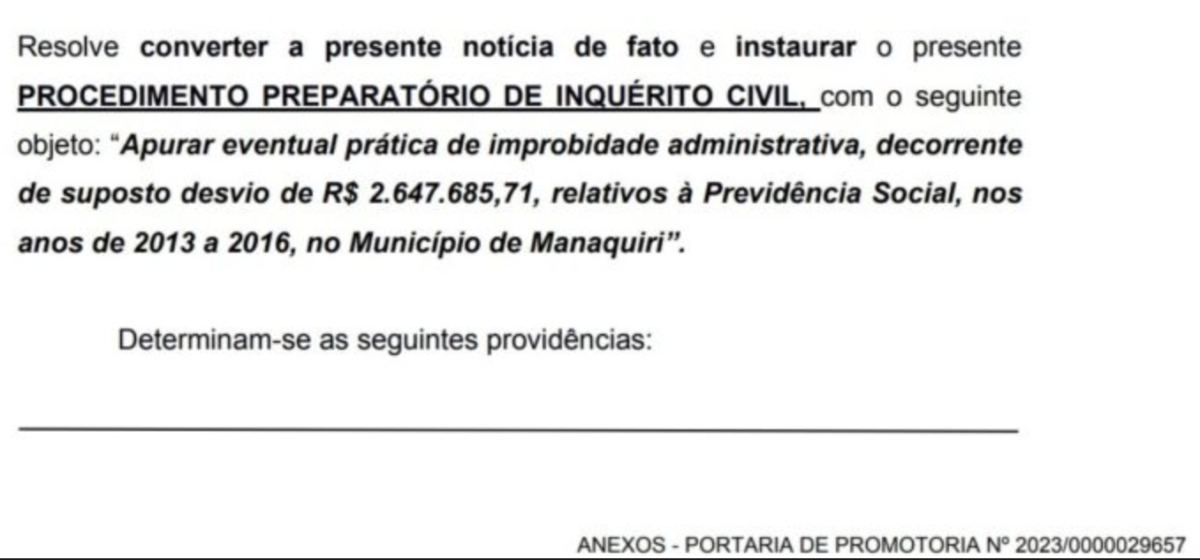 “Apurar eventual prática de improbidade administrativa, decorrente de suposto desvio de R$ 2.647.685,71, relativos à Previdência Social, nos anos de 2013 a 2016, no Município de Manaquiri”, segundo o trecho da decisão.
