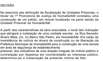 “Além da exposição de crianças e adolescentes em local que abriga criminosos, com registro de fuga de presos, de arremesso de substâncias entorpecentes e de presença de traficantes em suas imediações, identificamos outros ilícitos, como a locação de um imóvel construído em terreno doado pelo Município de Humaitá e sem alvará de construção”, revelou o Promotor de Justiça.