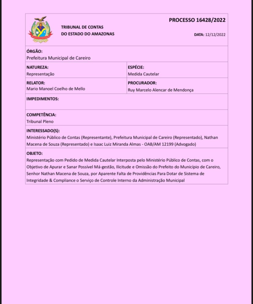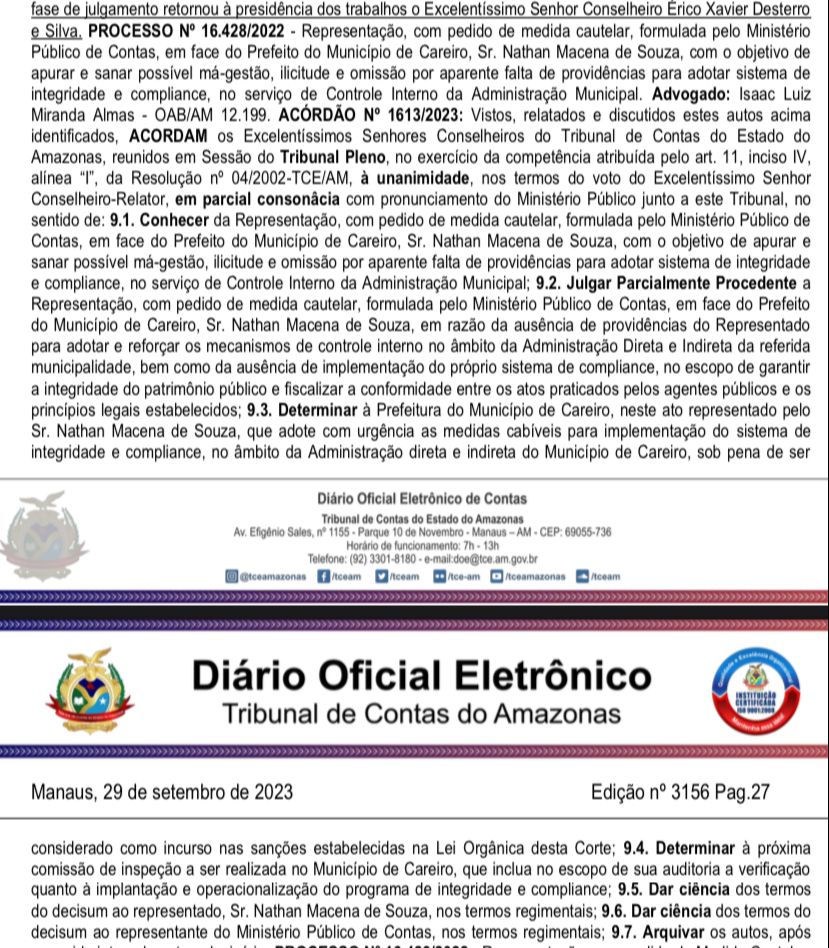 A medida cautelar, publicada no Diário Oficial Eletrônico do TCE-AM, foi requerida pelo procurador Ruy Marcelo de Alencar Mendonça e tem como foco a aparente falta de providências para implementar um sistema de integridade e compliance no serviço de controle interno da administração municipal.
