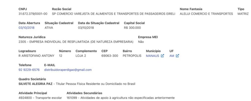 Outro fator estranho é que a atividade principal da empresa A SP Comércio Varejista, é o serviço de transporte escolar.