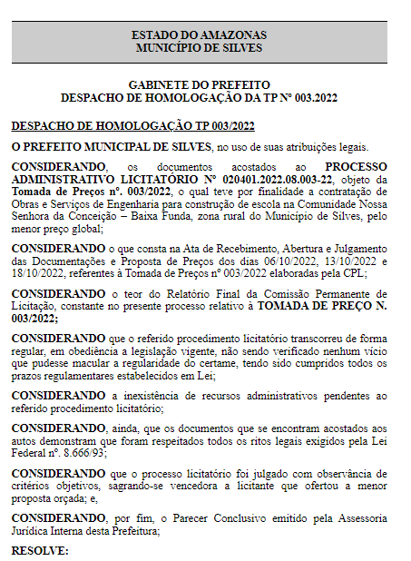 A empresa contratada para a realização de “obras e Serviços de Engenharia para construção de escola na Comunidade Nossa Senhora da Conceição – Baixa Funda, zona rural do Município de Silves” vai receber da Prefeitura o valor global de R$ 2.386.708,83 (dois milhões, trezentos e oitenta e seis mil, setecentos e oito reais e oitenta e três centavos). O documento não detalha prazo de obras e nem mais informações referente ao certame.