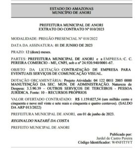 O contrato, assinado pelo prefeito Reginaldo Nazaré e divulgado no Diário Oficial dos Municípios em 15 de junho, prevê um gasto de R$ 1.159.027,54 (um milhão cento e cinquenta e nove mil, vinte sete reais, cinquenta e quatro centavos) com a empresa vencedora da licitação, C. C. Pereira Comércio.