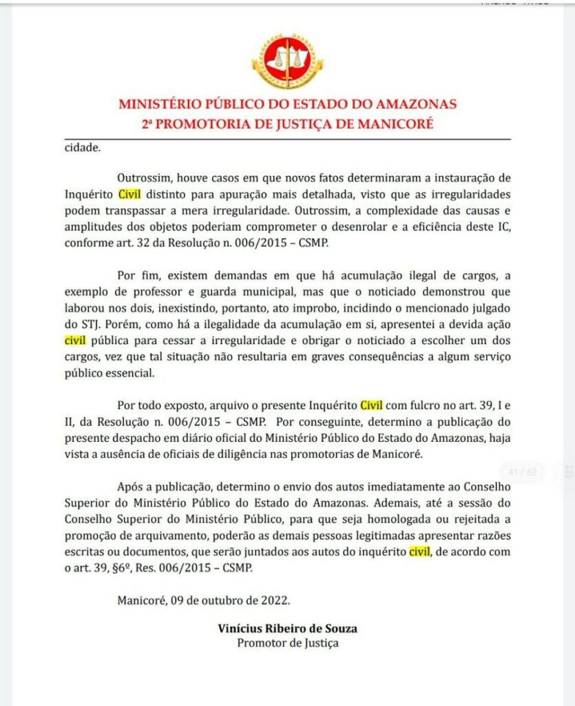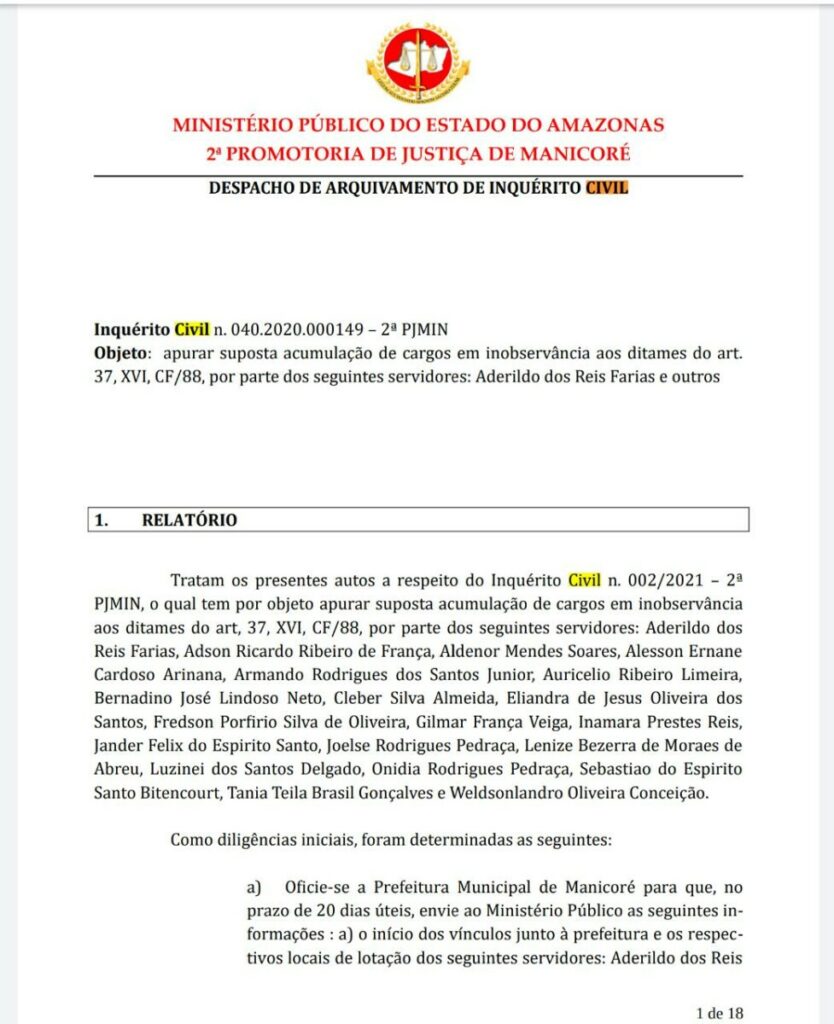 Ao todo, 20 pessoas foram investigadas pelo Ministério Público que deve fazer uma investigação mais detalhada do acúmulo de cargos. Quanto ao Inquérito Civil registrado no documento, o Conselho Superior do Ministério Público do Amazonas deve homologar ou rejeitar a promoção de arquivamento.