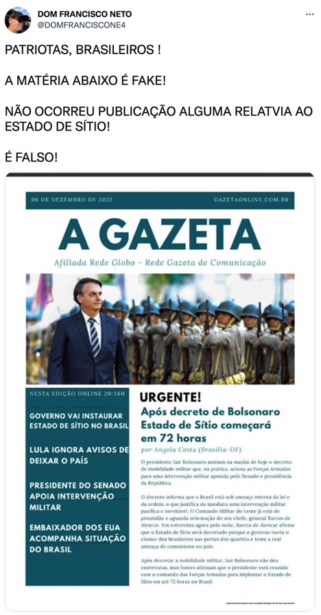 Brasil – Usuários de redes sociais compartilharam nesta quarta-feira (7) uma montagem de A Gazeta que mostrava uma desinformação, afirmando que o presidente Jair Bolsonaro (PL) decretou estado de sítio no Brasil. Entretanto, o presidente do Brasil em exercício não assinou qualquer decreto neste sentindo.