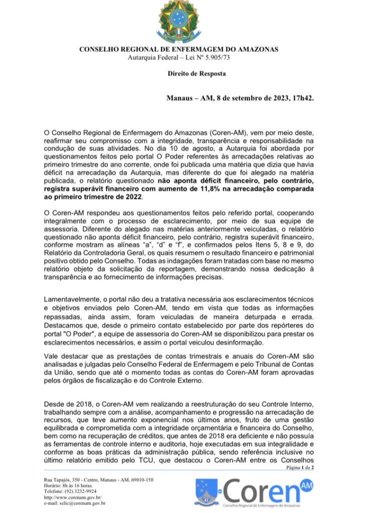 Presidente do Coren-AM nega existência de déficit contábil em relatório; leia a nota