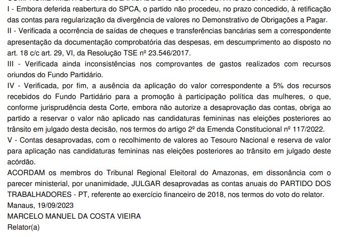 Diante das múltiplas irregularidades apontadas, o TRE-AM tomou a decisão de desaprovar as contas do PT no Amazonas, determinando o recolhimento dos valores ao Tesouro Nacional e a reserva de recursos para aplicação nas candidaturas femininas nas próximas eleições após o trânsito em julgado desta decisão.