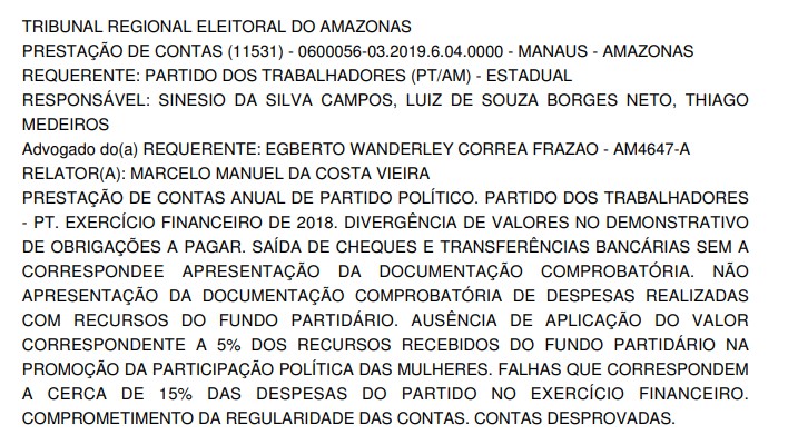 A decisão, que foi publicada no Diário Eletrônico do TRE-AM nesta segunda-feira (2), destaca que o presidente estadual do PT-AM, o deputado Sinésio Campos, foi citado no processo como responsável.