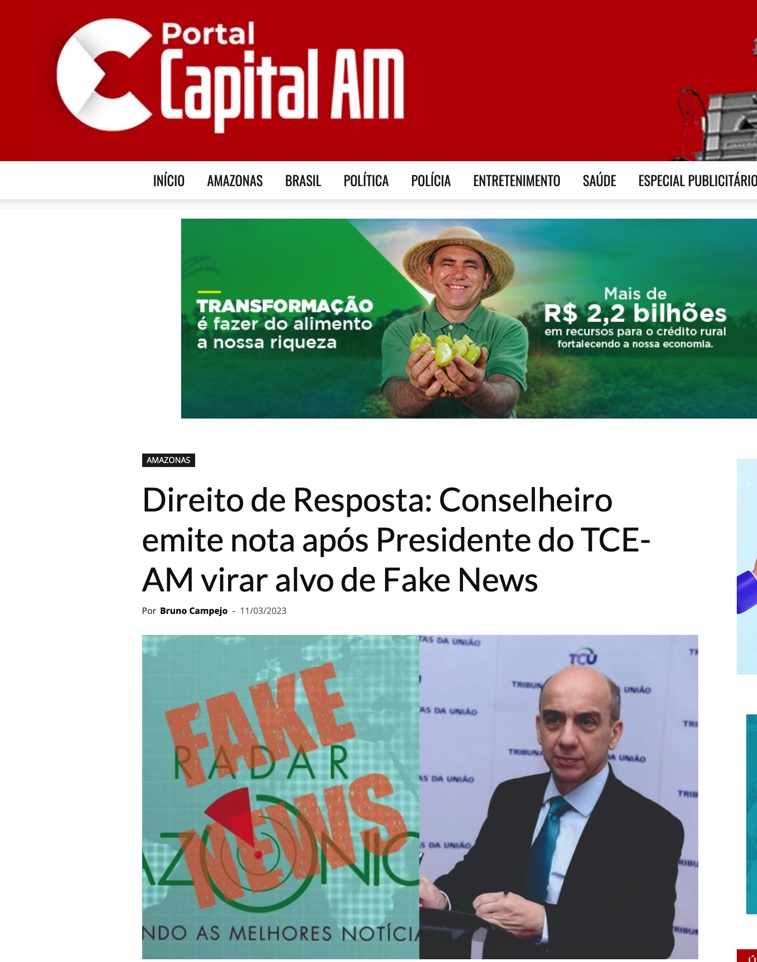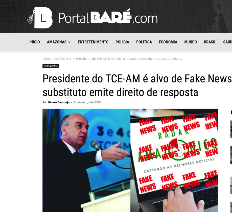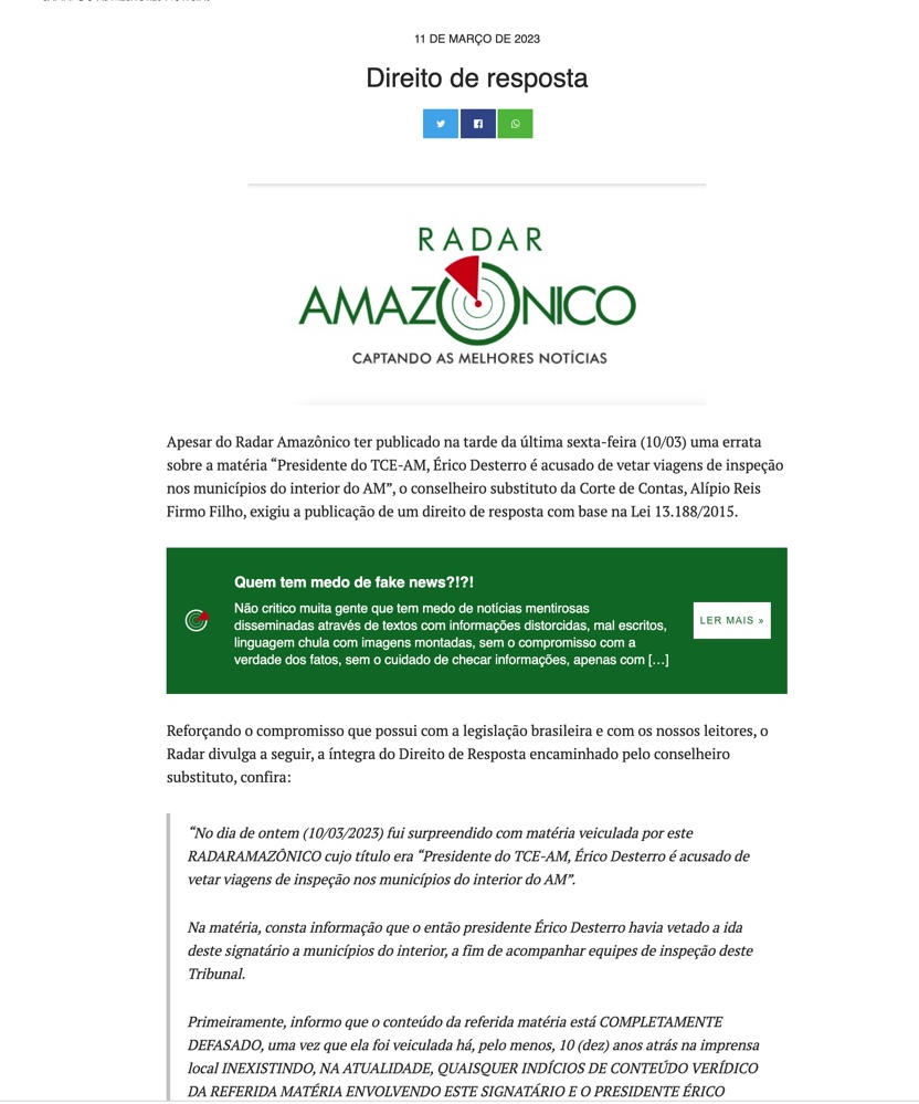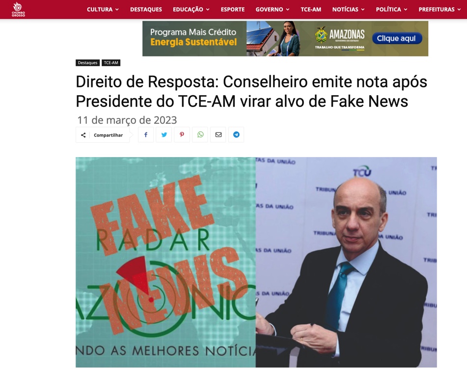 O blog de Any Margareth, o radar Amazônico, também teve que postar o direito de resposta do Tribunal de Contas do Estado do Amazonas (TCE-AM) após ter publicado a Fake News. Leia na íntegra: