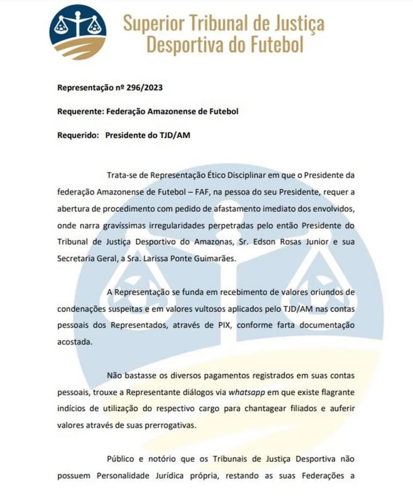 Segundo documento, a representação nº 296/2023 se funda “em recebimento de valores oriundos de condenações suspeitas e em valores vultosos aplicados pelo TJD-AM nas contas pessoais dos representados (Edson Rosas e a secretária), através de PIX, conforme documentação.