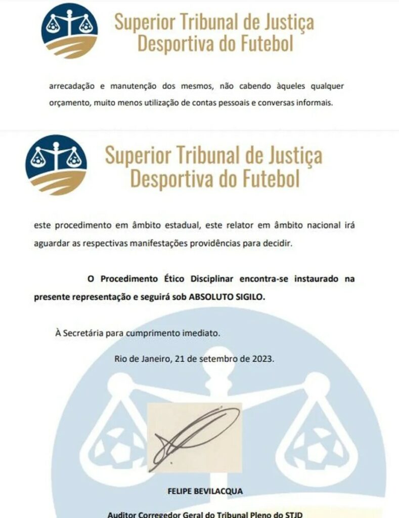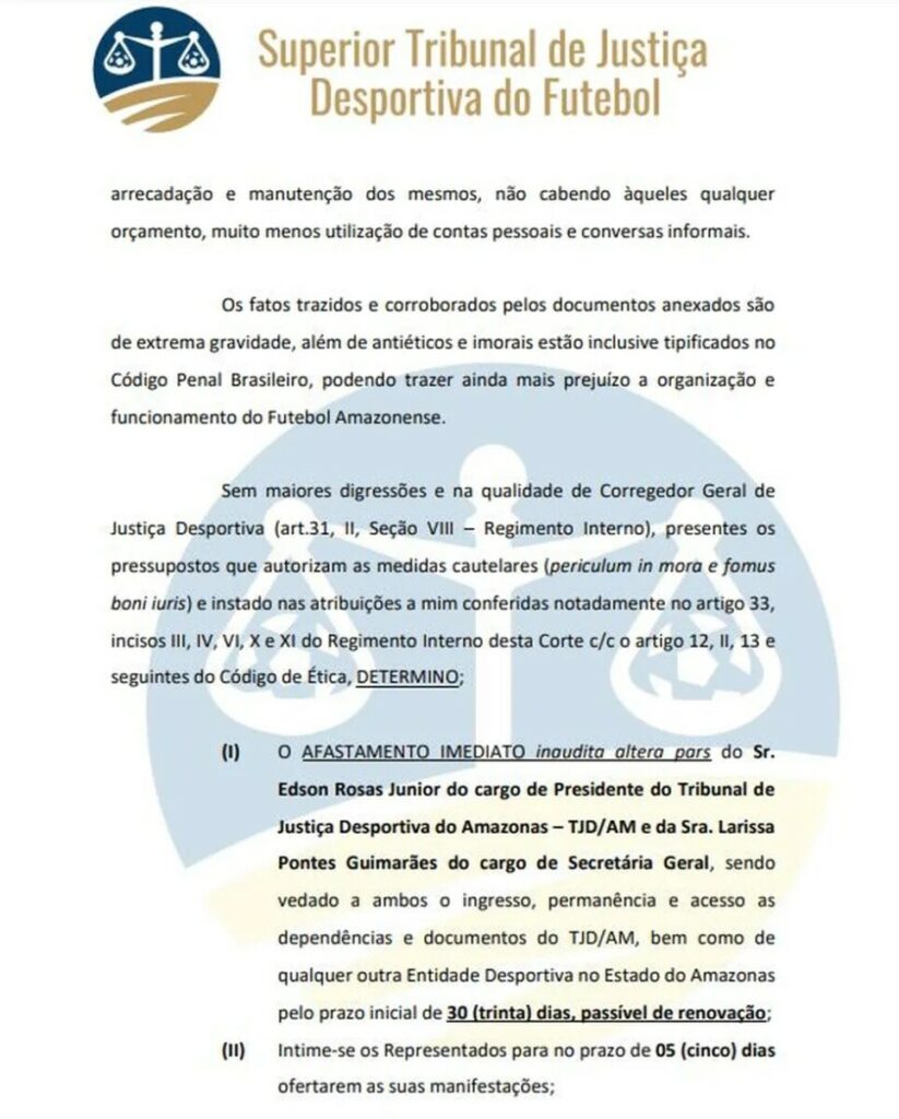 O Auditor Corregedor Geral do Tribunal Pleno do Superior Tribunal de Justiça Desportiva (STJD), Felipe Bevilac, atendeu pedido de Rozenha e determinou o afastamento imediato de Edson e da secretária por conta de supostas irregularidades.