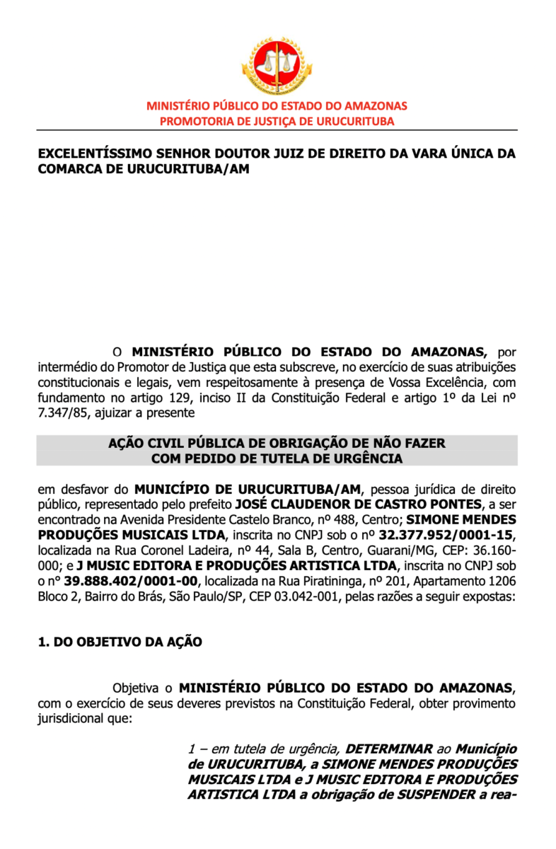 No documento publicado no Diário Oficial dos Municípios, consta que o prefeito de Urucurituba, José Claudenor de Castro Pontes, conhecido como Sabugo (PT), pagaria R$450 mil para a cantora Simone Mendes e mais R$150 mil para a cantora Joelma. O Ministério Público requereu a procedência do pedido e a decretação da nulidade da contratação, condenando o município de Urucurituba a se abster de ordenar ou realizar pagamentos com recursos públicos para os shows artísticos.