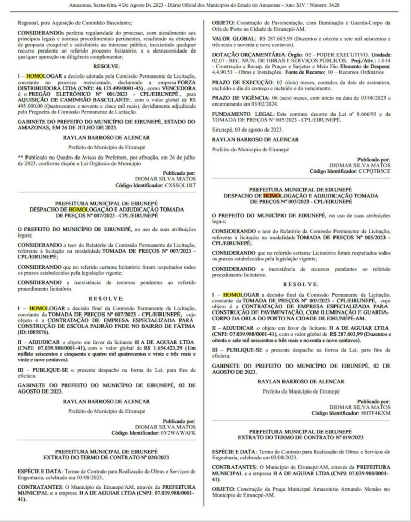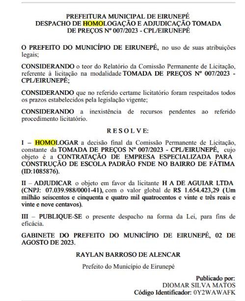 Amazonas – Na edição desta sexta-feira (4) do diário oficial da Associação Amazonense de Municípios (AAM), foi publicado o Despacho de Homologação e Adjudicação da Tomada de Preços nº 007/2023, onde o prefeito de Eirunepé, Raylan Barroso (União Brasil), autorizou o investimento de R$ 1,6 milhão na construção de uma escola no município.