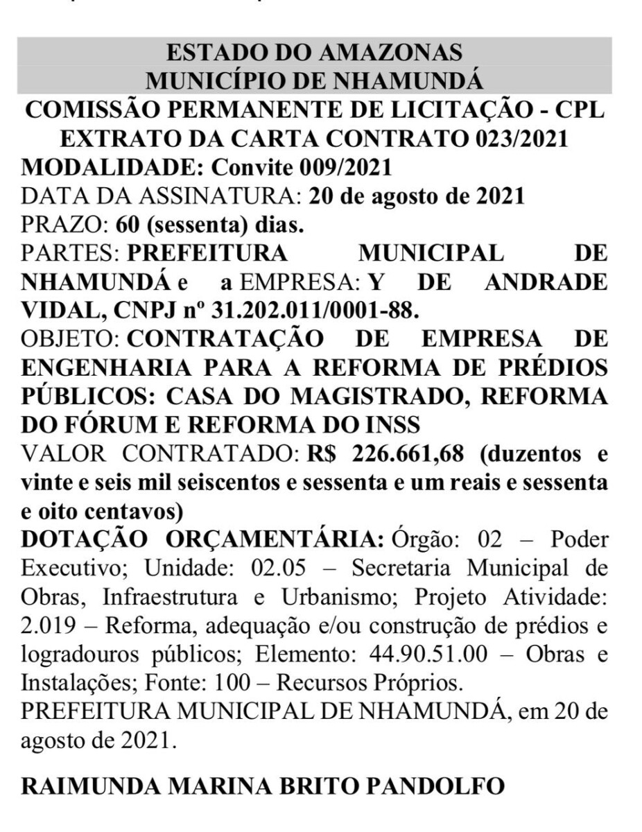 Além disso, o documento também especifica que a Y DE ANDRADE VIDAL foi contratada para reformar a “CASA DO MAGISTRADO, REFORMA DO FÓRUM E REFORMA DO INSS”. O documento também tem assinatura da prefeita de Nhamundá, Marina Pandolfo.