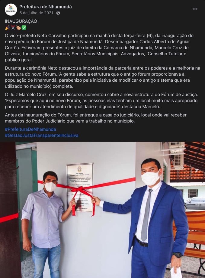 Conforme a denúncia recebida pelo Portal CM7 Brasil, no dia 6 de julho de 2021, o prédio Desembargador Carlos Alberto de Aguiar Corrêa, Fórum de Justiça de Nhamundá, foi inaugurado pelo vice prefeito Neto Carvalho. A publicação chegou a ser divulgada nas redes sociais. Confira: