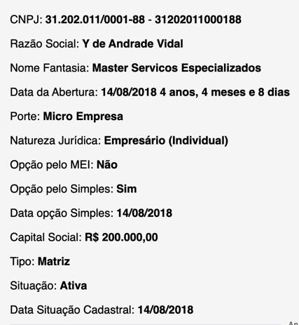 No entanto, no dia 20 de agosto, 1 mês e 14 dias depois, um contrato com a empresa “MASTER SERVIÇOS ESPECIALIZADOS” (CNPJ: 31.202.011/0001-88) com a licitação solicitando o serviço de reforma do prédio recém-inaugurado foi divulgada, destinando o valor de R$ 226.661,68. Ainda segundo o documento, o real nome da empresa favorecida é Y DE ANDRADE VIDAL, que possui como atividade principal, segundo a Receita Federal, a locação de embarcações sem tripulação, exceto para fins recreativos.