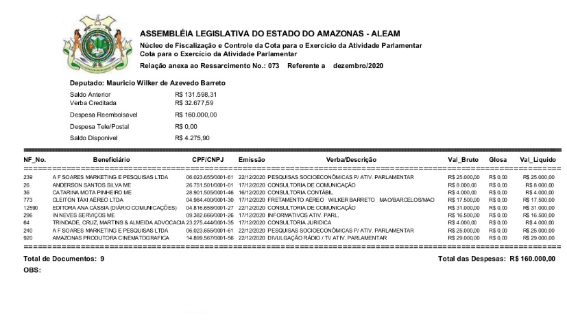 De acordo com o Portal da Transparência da Casa Legislativa, Wilker pagou no mês de dezembro de 2020, R$ 31 mil à Editora Ana Cássia que, conforme descrito no espelho das despesas, serviu para ”consultoria de comunicação”. Durante o período de outubro de 2019 a abril de 2020, o deputado mantinha semanalmente uma coluna no jornal Dez Minutos e no Portal 24AM. Que coincidência , não é?