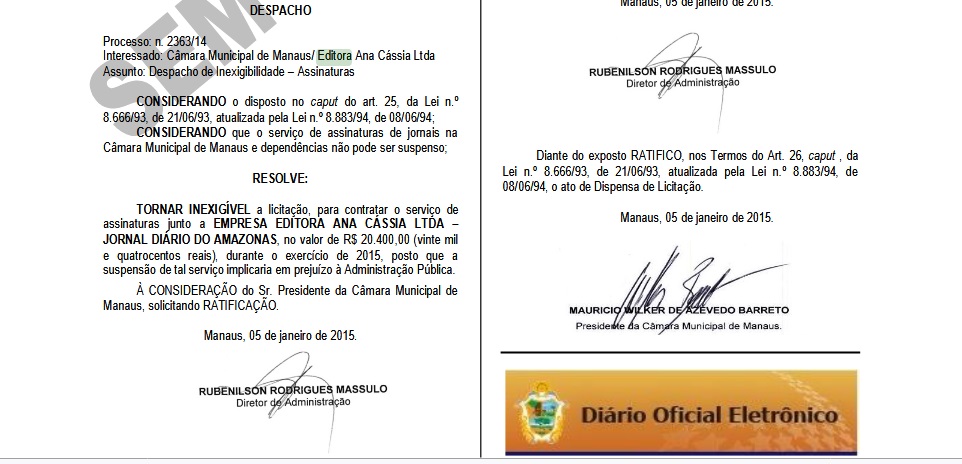 Ainda em 2015, Wilker também assinou um contrato com Editoria Ana Cássia, com dispensa de licitação, no valor de R$ 20.400 durante todo o exercício daquele ano, ”posto que a suspensão de tal serviço implicaria em prejuízo à Administração Público”. O serviço ‘contratado’ era o fornecimento do Jornal Diário do Amazonas.