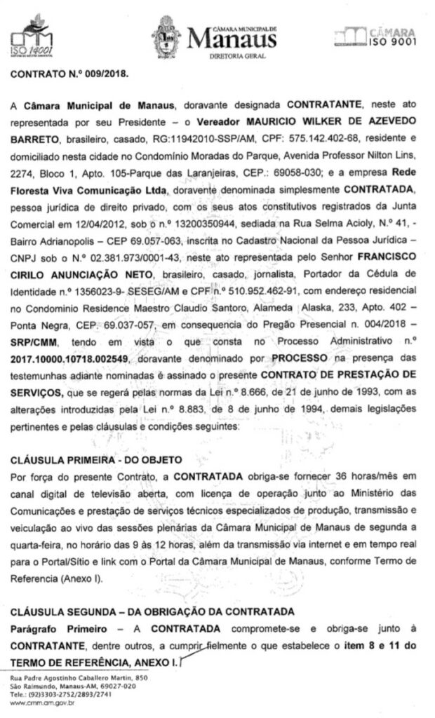 Com a gentil prorrogação do contrato até os dias atuais, a empresa de Cyro continua a prestar os mesmos serviços, ou seja, locação de toda infraestrutura necessária dos sistemas de transmissão, irradiação, estúdio, torre, abrigo, climatização e energia para difundir o sinal de Rádio Câmara de Manaus na frequência de 105,5 MHz, decorrente do Pregão Presencial n.º 016/2018- CMM.