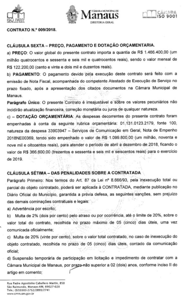 O contrato no valor de aproximadamente R$ 3 milhões e 700 mil, teve duração de um ano e foi firmado para veicular as sessões da câmara na local TV, emissora que nunca teve grande audiência em Manaus, voltou a operar na TV Câmara para viabilizar o sinal digital, com aluguel de equipamentos, instalação e manutenção das transmissões das sessões plenárias ao vivo.