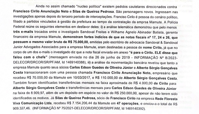A investigação da PF junto à Receita Federal apuraram que Cirilo Anunciação e seu sócio na Rede Floresta Viva Comunicação Ltda, Silas de Queiroz Pedrosa, receberam altos valores da Mamute. Confira abaixo um trecho do levantamento das autoridades: