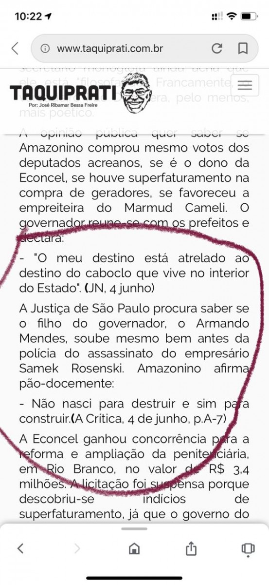 “Lancetar o tumor” — “Jamais tive e não tenho testa-de-ferro e vou provar que a Econcel nunca recebeu privilégios para realizar obras no Estado”, diz Amazonino Mendes.
